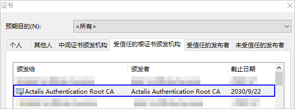 3. 在受信任的根证书颁发机构 > 证书中,找到Actalis Authentication Root CA,点击鼠标右键选择“属性”。