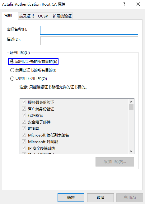 4. 选择“启用此证书的所有目的(E)”,点击确定。然后重启浏览器即可。