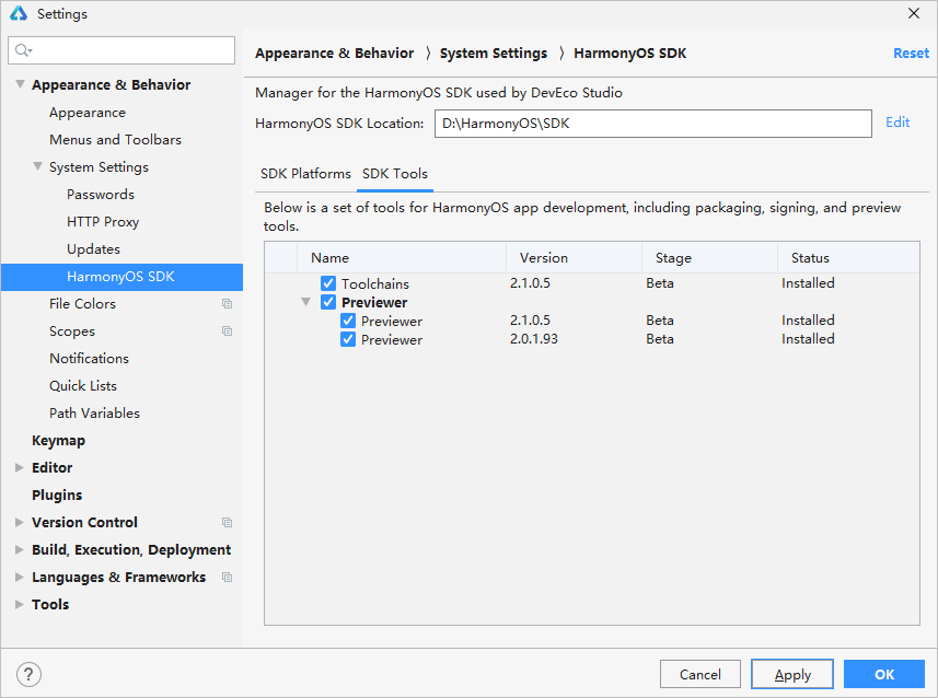 2. 未下载预览器资源:请在File > Settings > Appearance&Behavior > System Settings > HarmonyOS SDK界面中,选择SDK Tools页签,下载Previewer。