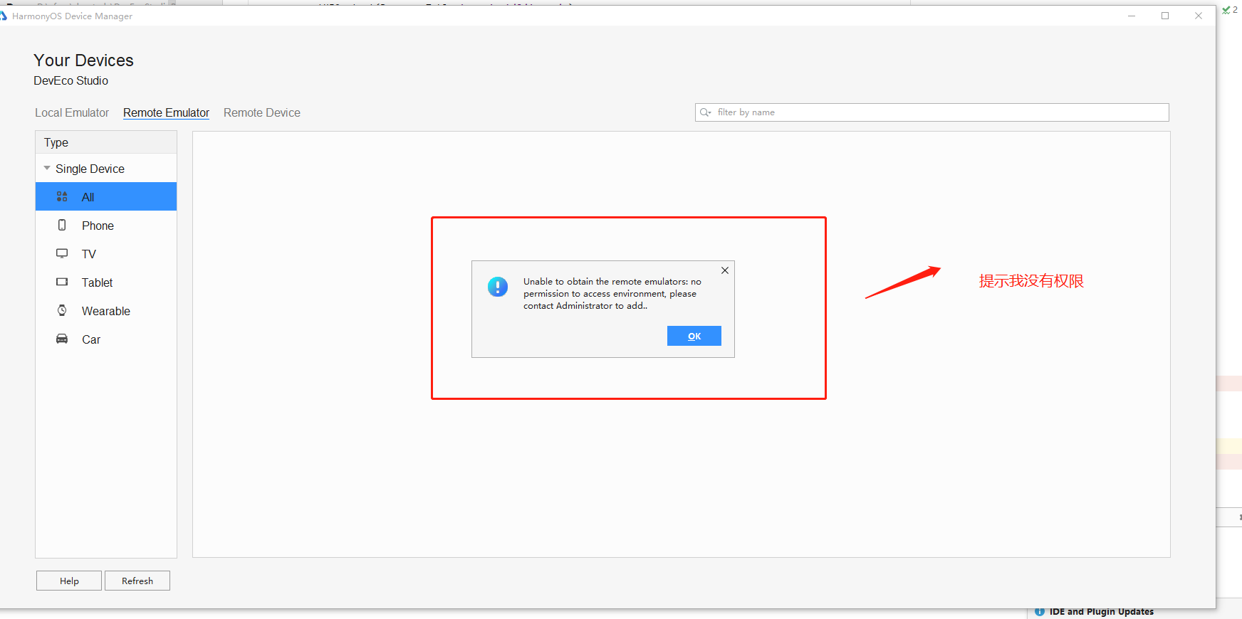 HarmonyOS 鸿蒙Next DevEco Studio模拟器登录成功提示无权限情况怎么解决 大佬们,救救我,这个提示无权限,怎么处理他,我前几天还能用的