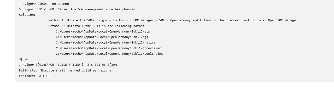 ANDROID_HOME或HARMONYOS_SDK_HOME环境变量正确指向SDK路径。 - 清理项目:执行