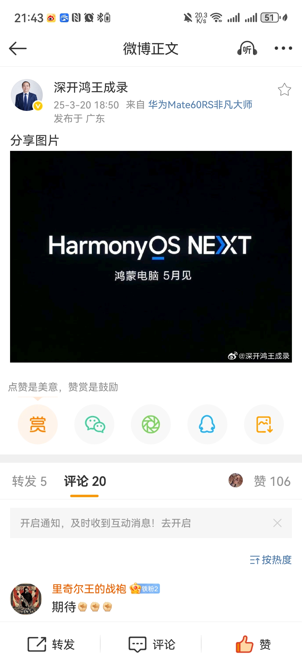 好消息,刚才看到HarmonyOS鸿蒙Next创始人王成录在微博上发了一个图片,说鸿蒙电脑5月见,真的是HarmonyOS鸿蒙Next版本的电脑要来了,大家应该都很期待了吧!