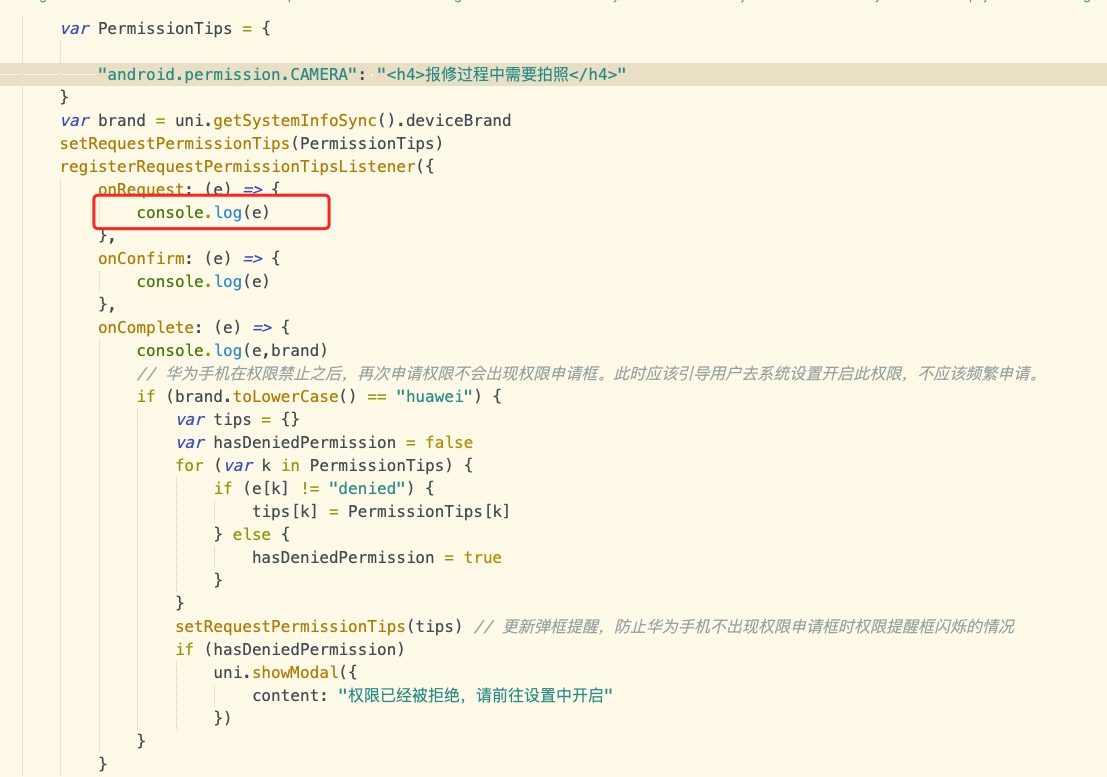 uni-registerRequestPermissionTips插件。通常,你需要在App.vue或其他入口文件中进行初始化:import registerRequestPermissionTips from 'uni-registerRequestPermissionTips'; export default { onLaunch() { registerRequestPermissionTips(); } }