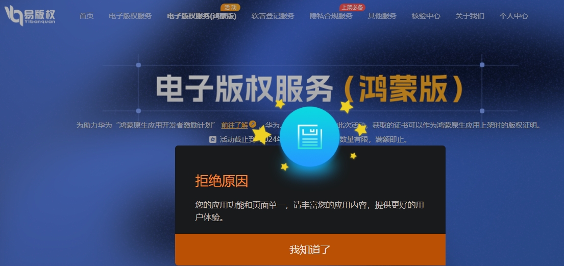 易版权审核问题 HarmonyOS 鸿蒙Next 易版权审核应用以应用功能不丰富拒绝审核,是不是越俎代庖了!工具类应用第一版本来页面不多,华为审核规则里也没有这种限制,强烈建议华为处理易版权,鸿蒙生态的绊脚石!
