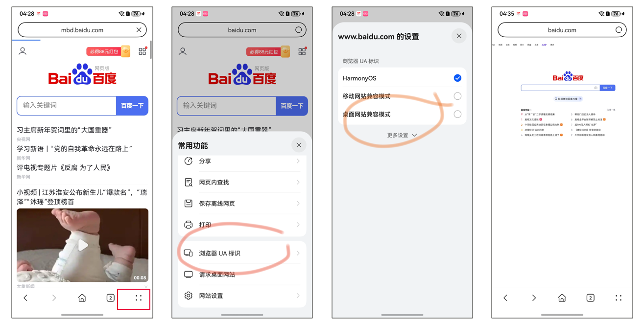HarmonyOS鸿蒙Next中测试next版本自带浏览器选择ua标识电脑模式无效,访问的仍是ua标识手机模式网页内容,bug?
