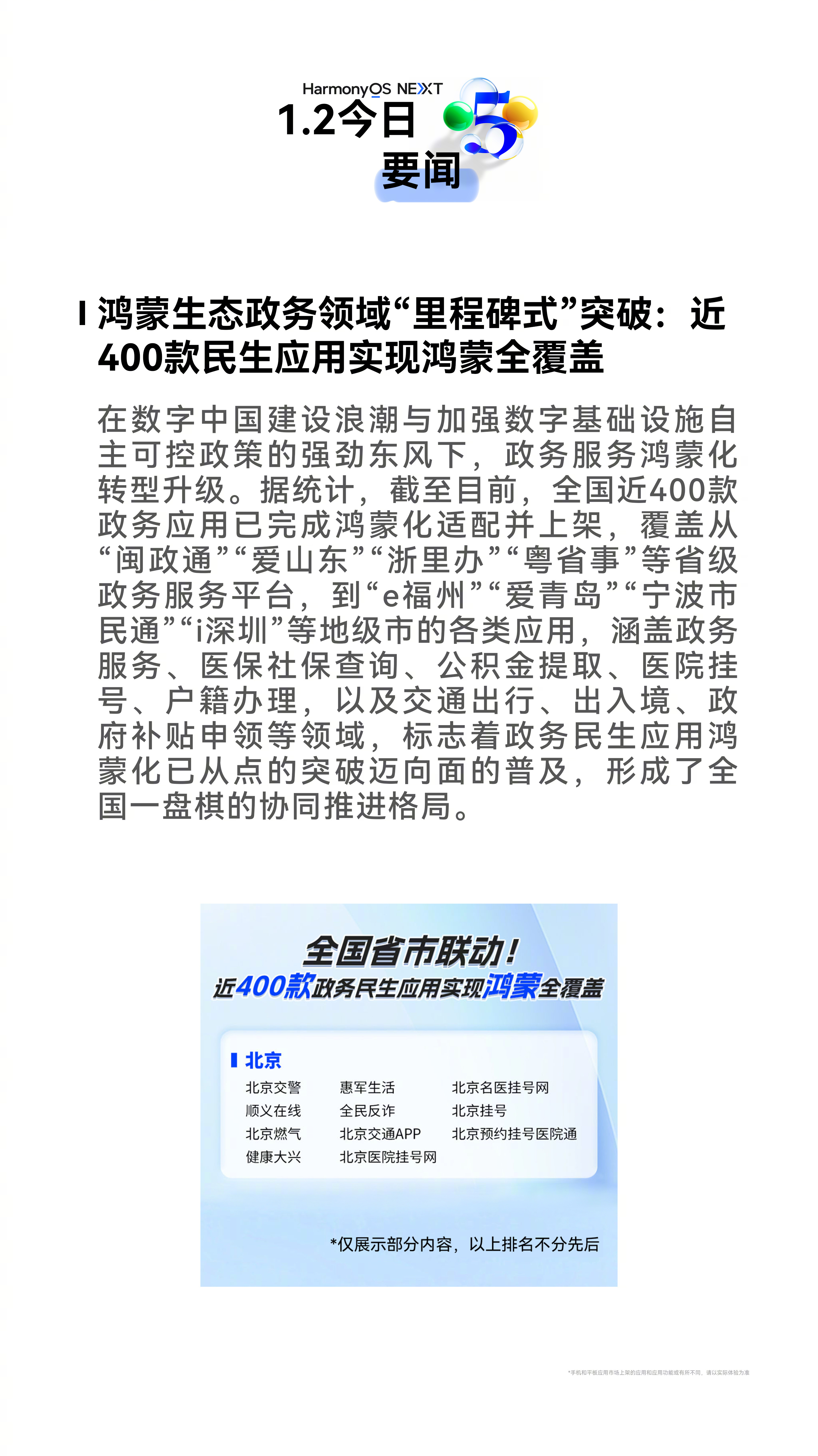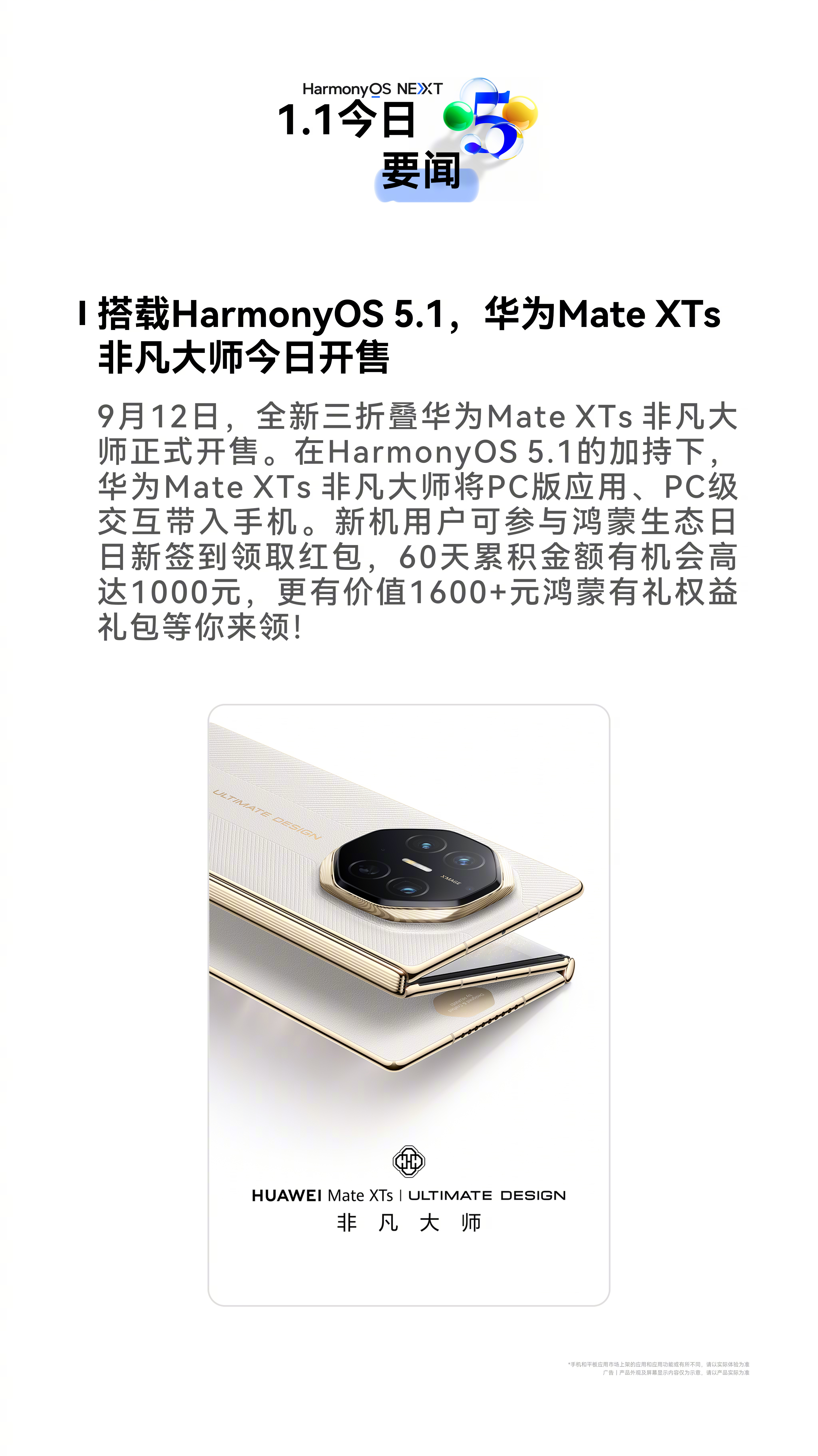 HarmonyOS鸿蒙Next生态9月12日日新PLOG 搭载HarmonyOS 5.1,华为Mate XTs 非凡大师今日开售;鸿蒙生态政务领域“里程碑式”突破,近400款民生应用实现鸿蒙全覆盖;小红书、Wind金融终端等多款应用也迎来重要更新;鸿蒙操作系统 5,更安全、更流畅、更智能,欢迎在“我的华为”App>升级尝鲜报名体验。#鸿蒙5大有不同##HarmonyOS5#