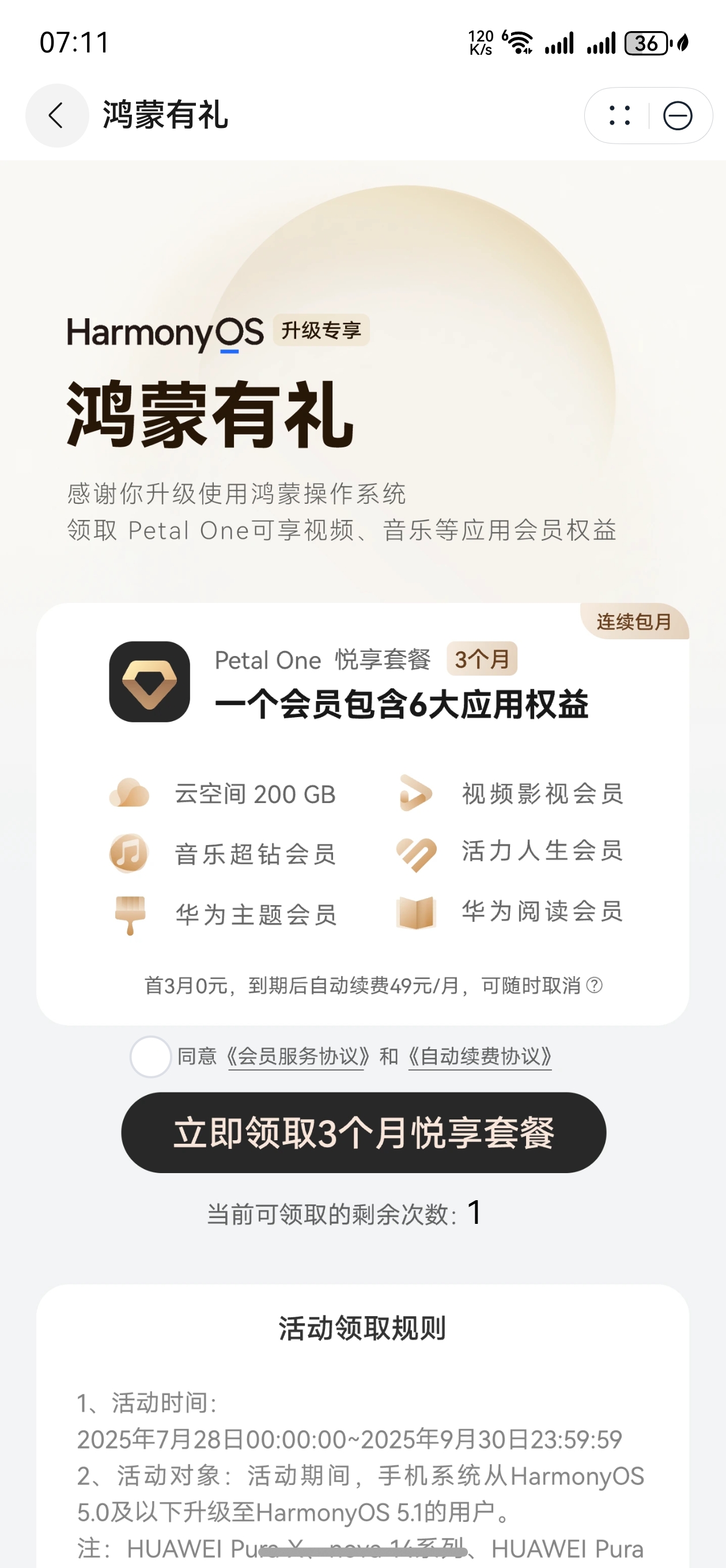 HarmonyOS鸿蒙Next升级到6,鸿蒙5领的会员还有吗
