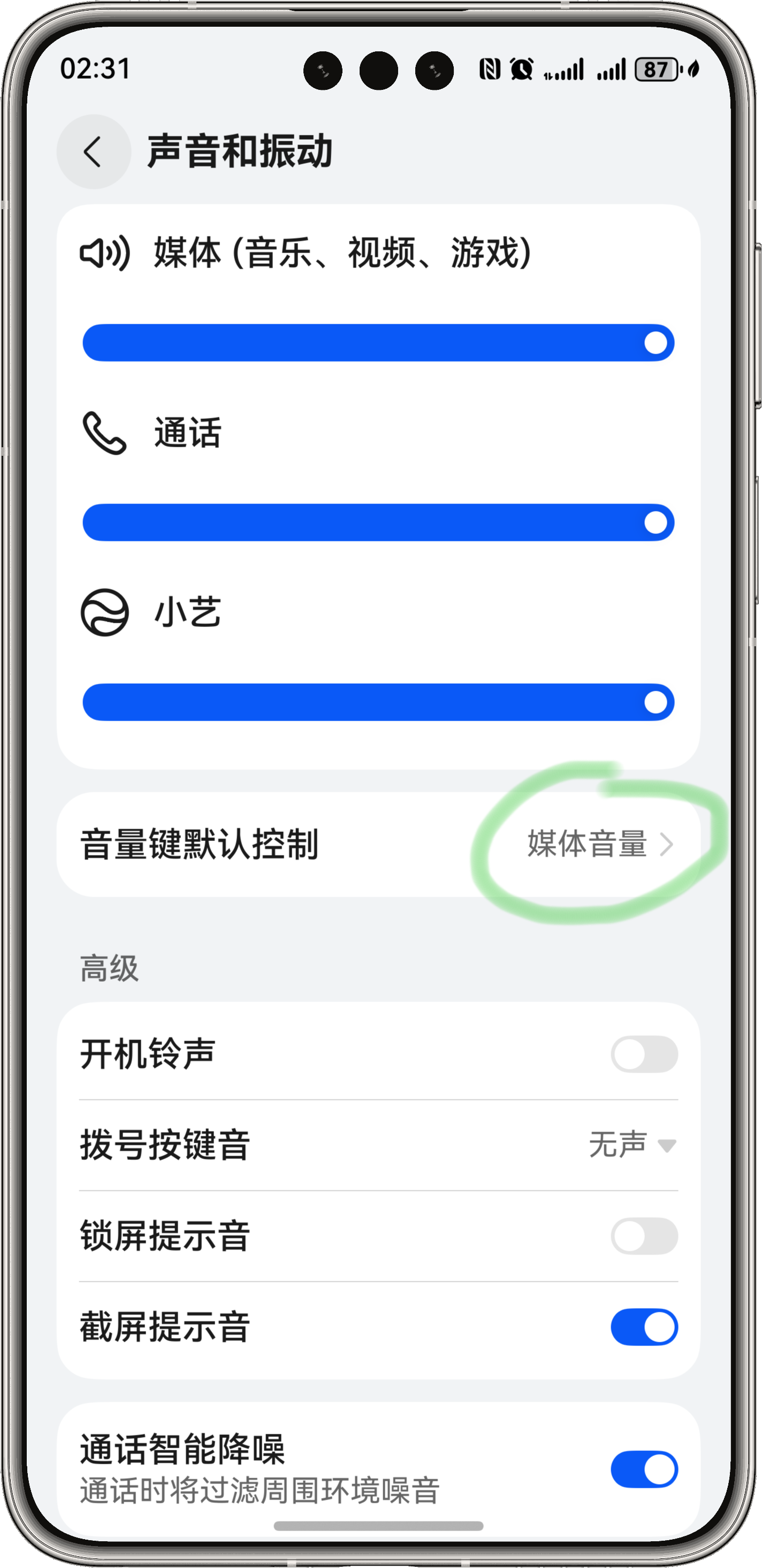 - 进入设置>声音和振动>音量,手动调整各通道音量测试响应
