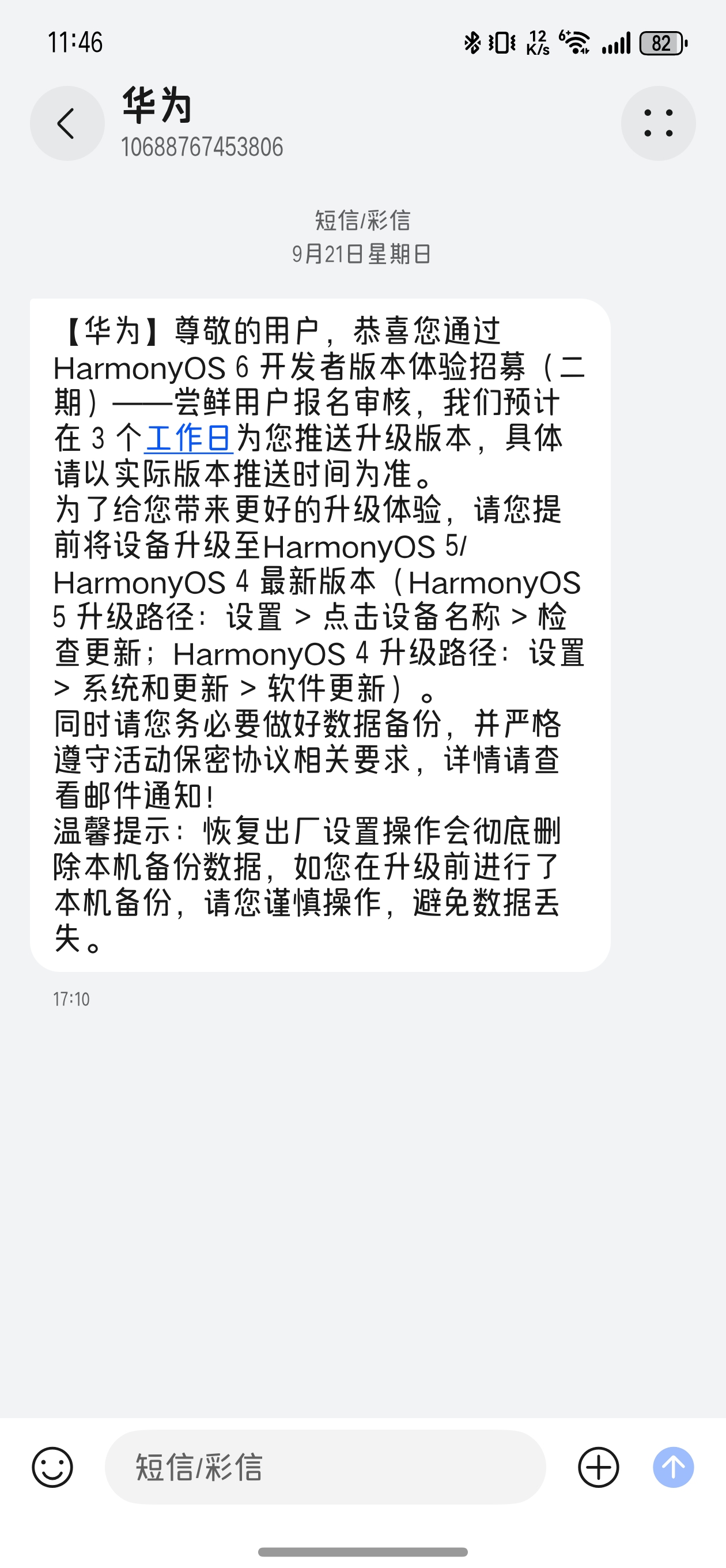 【华为】恭喜您通过 HarmonyOS 6 开发者版本体验招募(二期)—尝鲜用户报名审核,我们预计在 3 个工作日为您推送版本,具体请以实际为准。