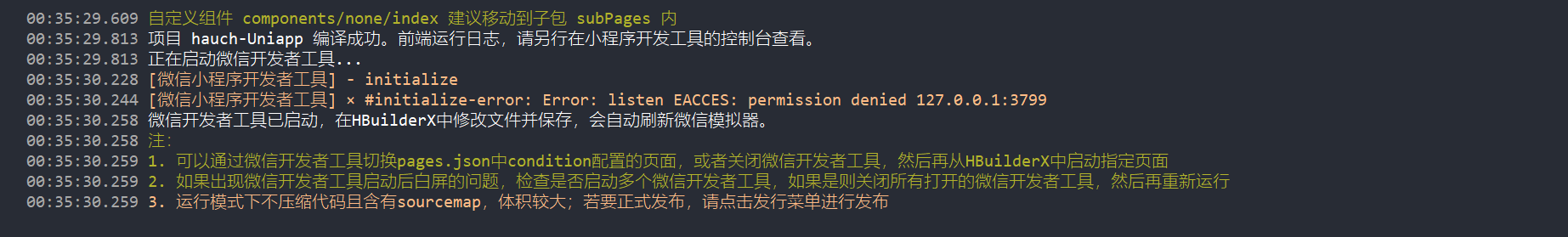 提示 uni-app × #initialize-error Error listen EACCES permission denied 127.0.0.1 3799