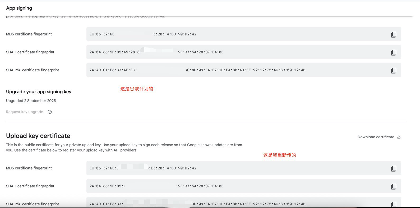 - 经排查是谷歌会再次打包,我将自己打包的jks替换谷歌的签名。已替换成功,谷歌商店显示,两者是一致的。
