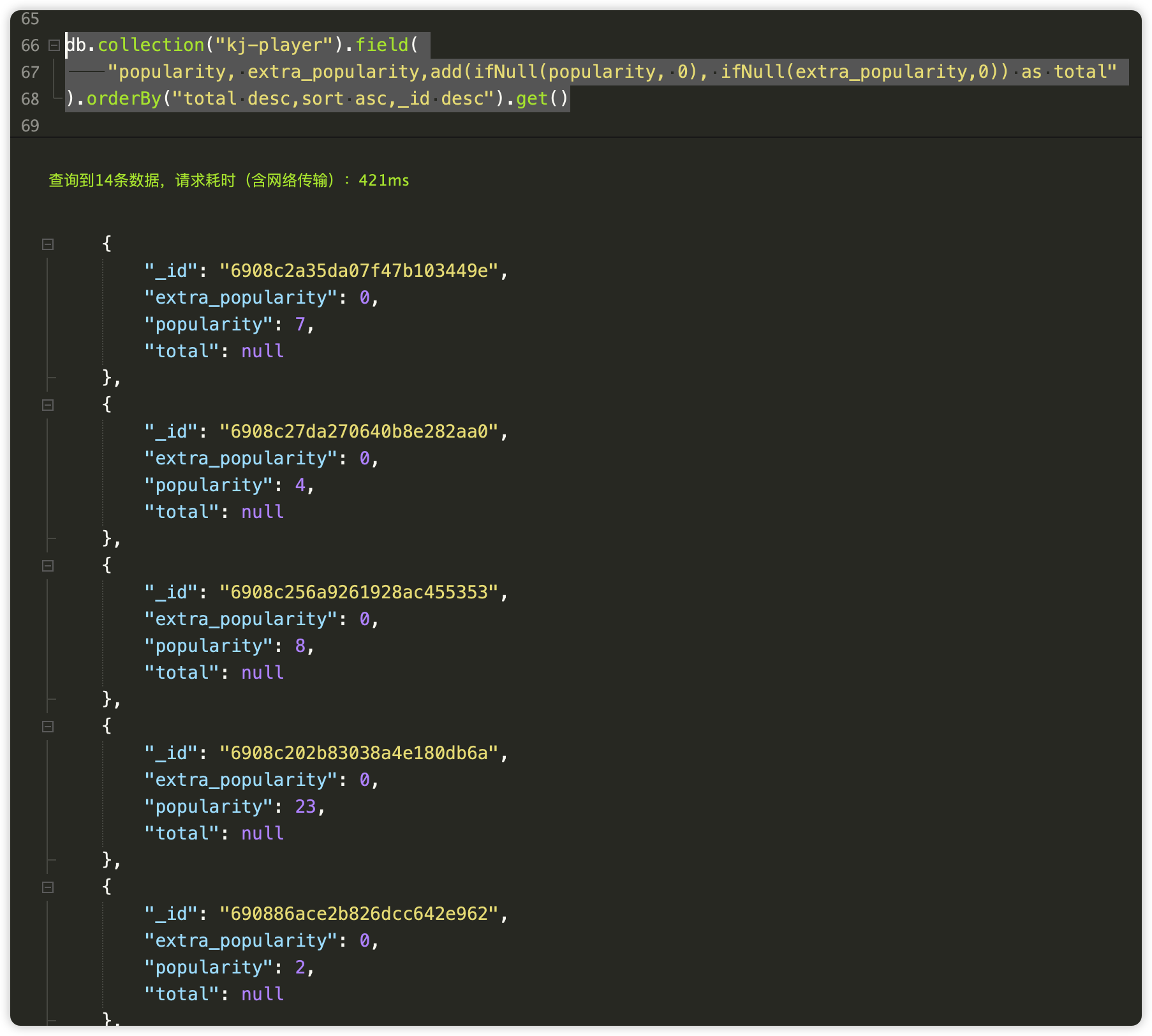 db.collection("tableName").field("a, b, add(a, b) as total").get(); - 返回的 total 理论上应该是 a + b ,实际上是 null,只要 a 或 b 任一不为 0,total 就是 null