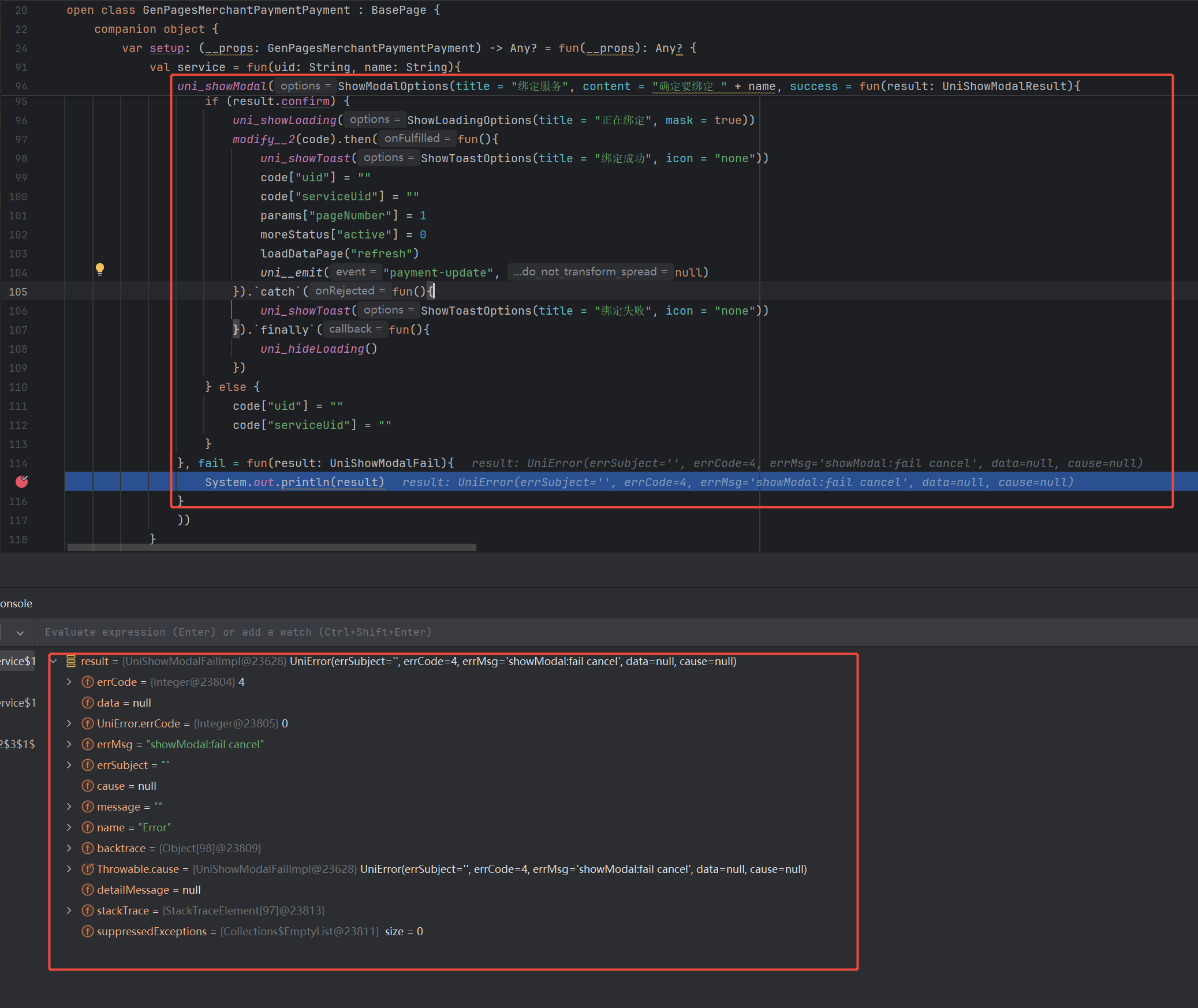 如附件在页面中使用uni.showModal模态框,标准基座场景可以正常弹出,离线打包到android设备后直接进入fail。