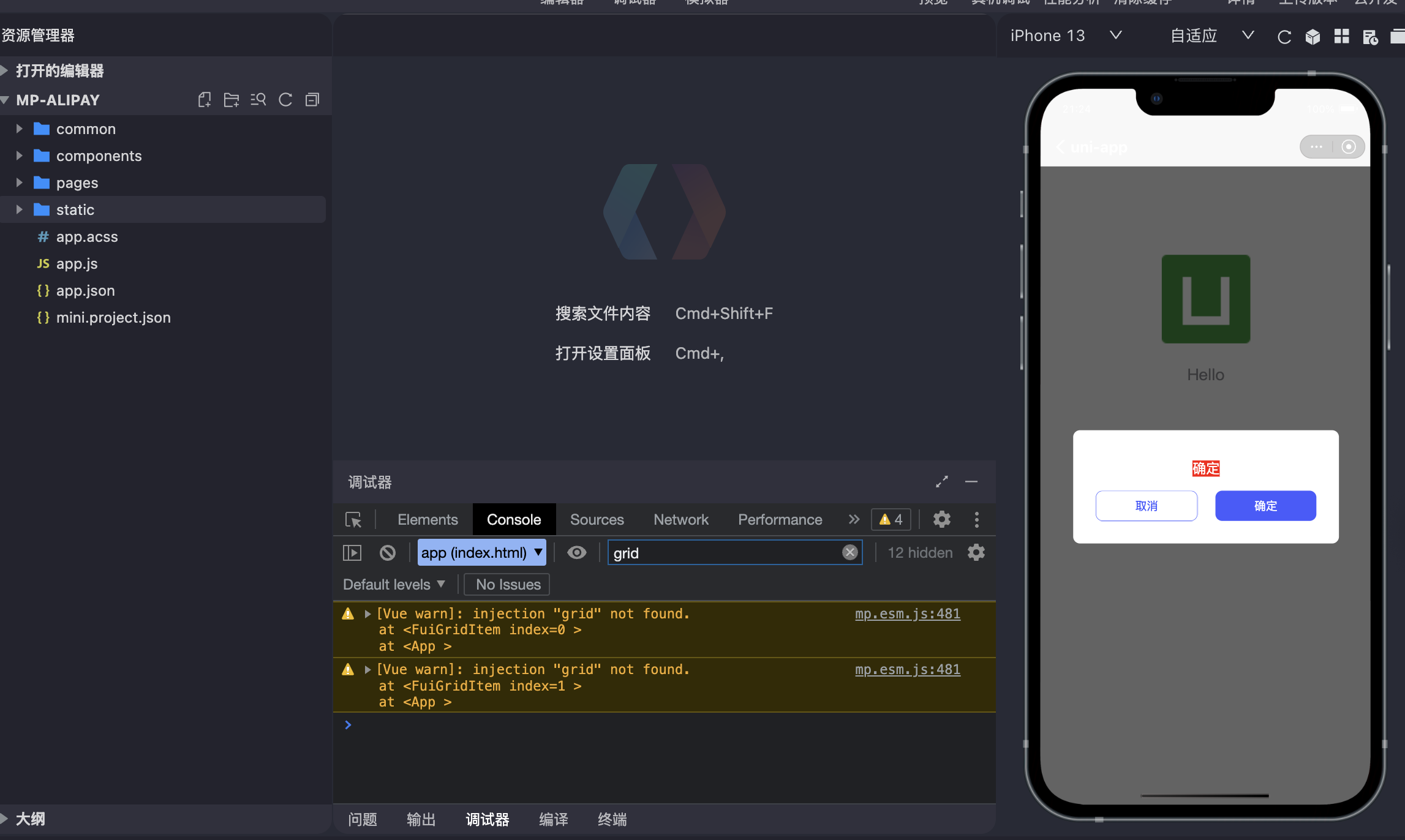 回复 DCloud_UNI_JBB: 我支付宝还是不行,其他端都没有问题的,我把发行的支付宝小程序放下面了,你试试我打包的看看。还有injection “grid” not found. \n at <FuiGridItem index=0 > \n at <App > 这个问题也会导致支付宝小程序中grid图标不显示。