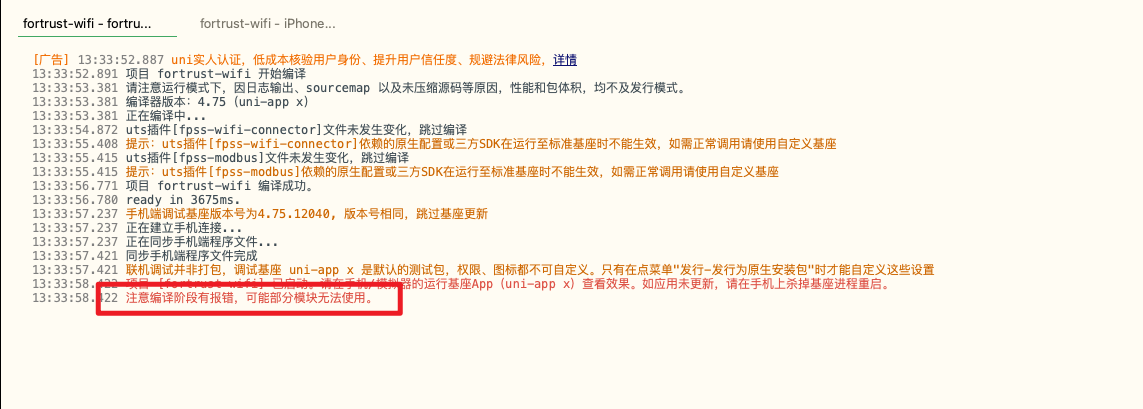 注意编译阶段有报错,可能部分模块无法使用。控制台根本没有其他信息显示!!!