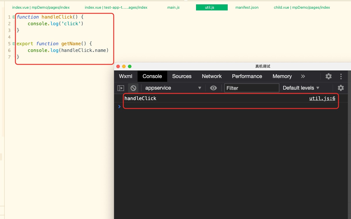 - 打印下函数的name属性就可以,然后运行到微信小程序,真机调试和模拟器调试两个结果