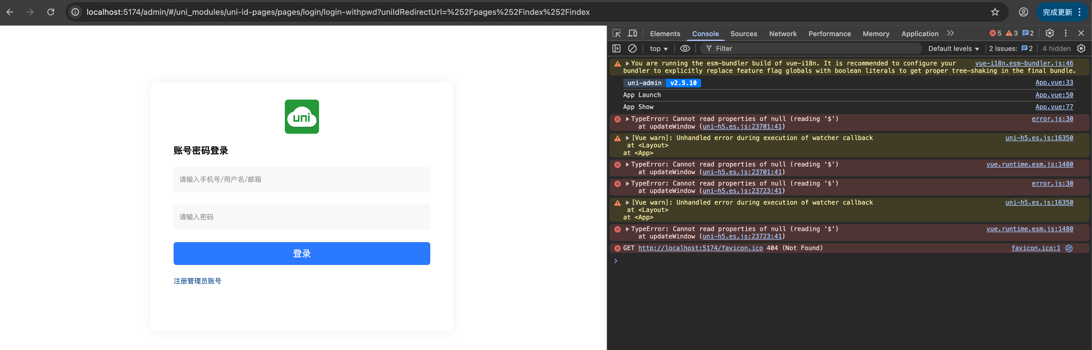 uni-admin的登陆页在uni-app中疑似因为没有使用顶部和左侧边栏模板导致Cannot read properties of null (reading '$') 报错
