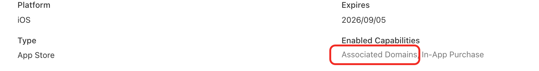 [Info] begin copyFile files to ipa… [Info] begin replace files to ipa… [Info] begin update mobileprovision to ipa… [Info] begin outPut t_entitlements_full plist file… [Info] begin outPut outPutEntitlements plist file… [Info] begin verifyPlistFiles [Error] Provisioning profile doesn’t support the Associated Domains [Error] Provisioning profile doesn’t include the com.apple.developer.associated-domains [Error] verifyPlistFiles failed [Info] 制作结果:Failed. Reason: 我的profile是包含了Associated Domains的,如图所示
