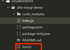 正确的做法是 index.js 引入tool.js,然后前端调用云函数 chb-mysql-demo即可,云函数入口只有一个,即 index.js