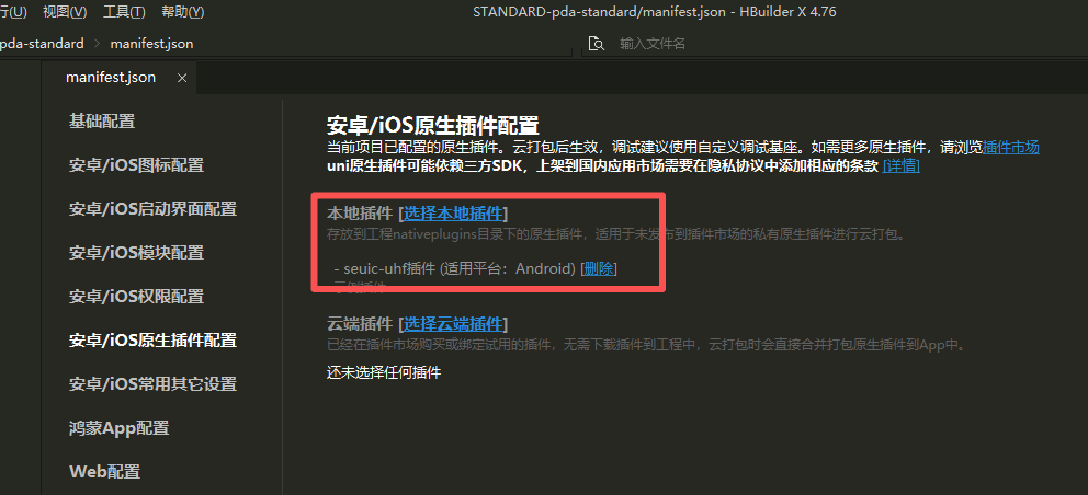 东集PDA设备,安卓9,读RFID原生插件,在更新HbuilderX版本之前是没问题的,升级到4.76版本之后突然出现这个问题,明明manifest.json里已经配置了原生插件,但是打自定义基座之后仍然报“当前运行的基座不包含原生插件”
