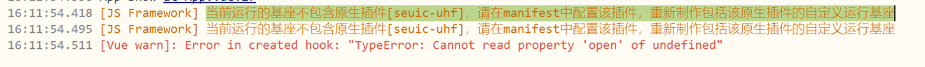 系统报错,提示“当前运行的基座不包含原生插件[seuic-uhf]”,请在manifest中配置该插件,重新制作包括该原生插件的自定义运行基座
