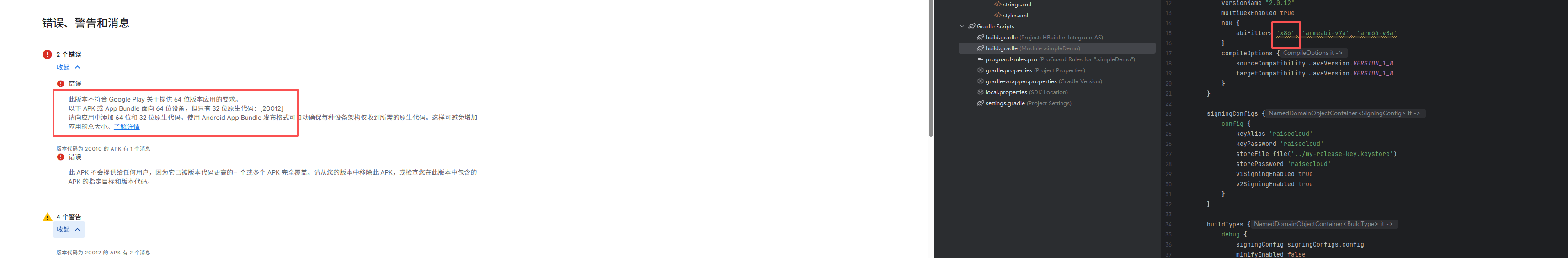 不符合 Google Play 关于提供 64 位版本应用的要求 这个能解决吗?拿掉x86就没这个问题了