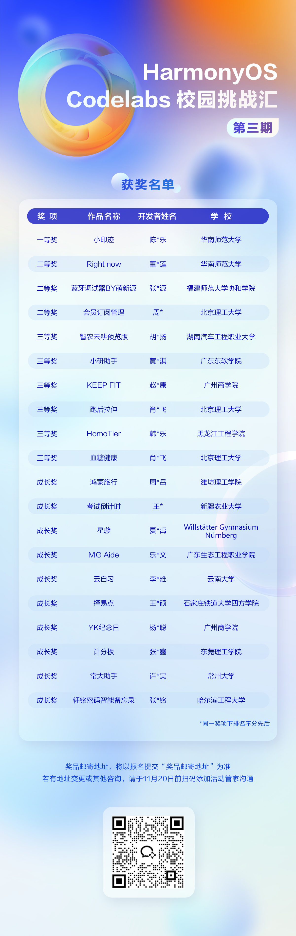 HarmonyOS鸿蒙Next Codelabs校园挑战汇获奖名单公布
