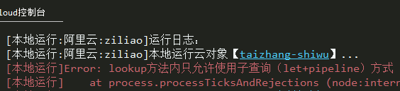 报错: 21:19:49.148 [本地运行:阿里云:ziliao]运行日志: 21:19:49.204 [本地运行:阿里云:ziliao]本地运行云对象【taizhang-shiwu】… 21:19:51.917 [本地运行]Error: lookup方法内只允许使用子查询(let+pipeline)方式