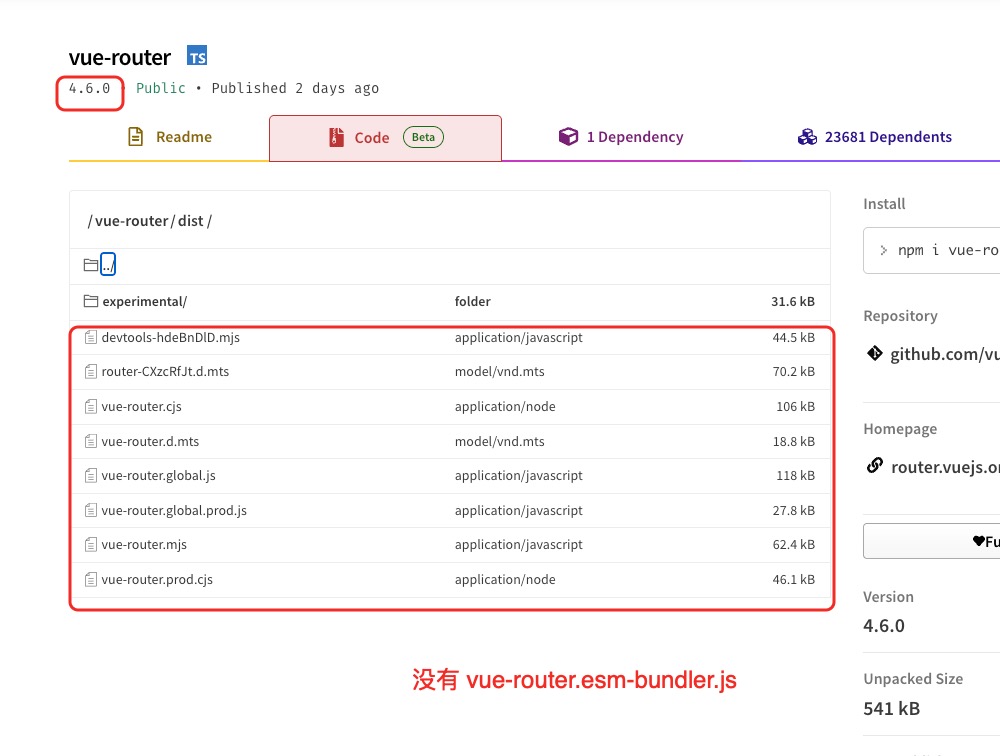 应该是安装到了 4.6.0 版本的 vue-router,这个版本移除了 vue-router.esm-bundler.js 文件,所以报错找不到这个文件了,我看最新的 4.6.3 版本又恢复了这个文件