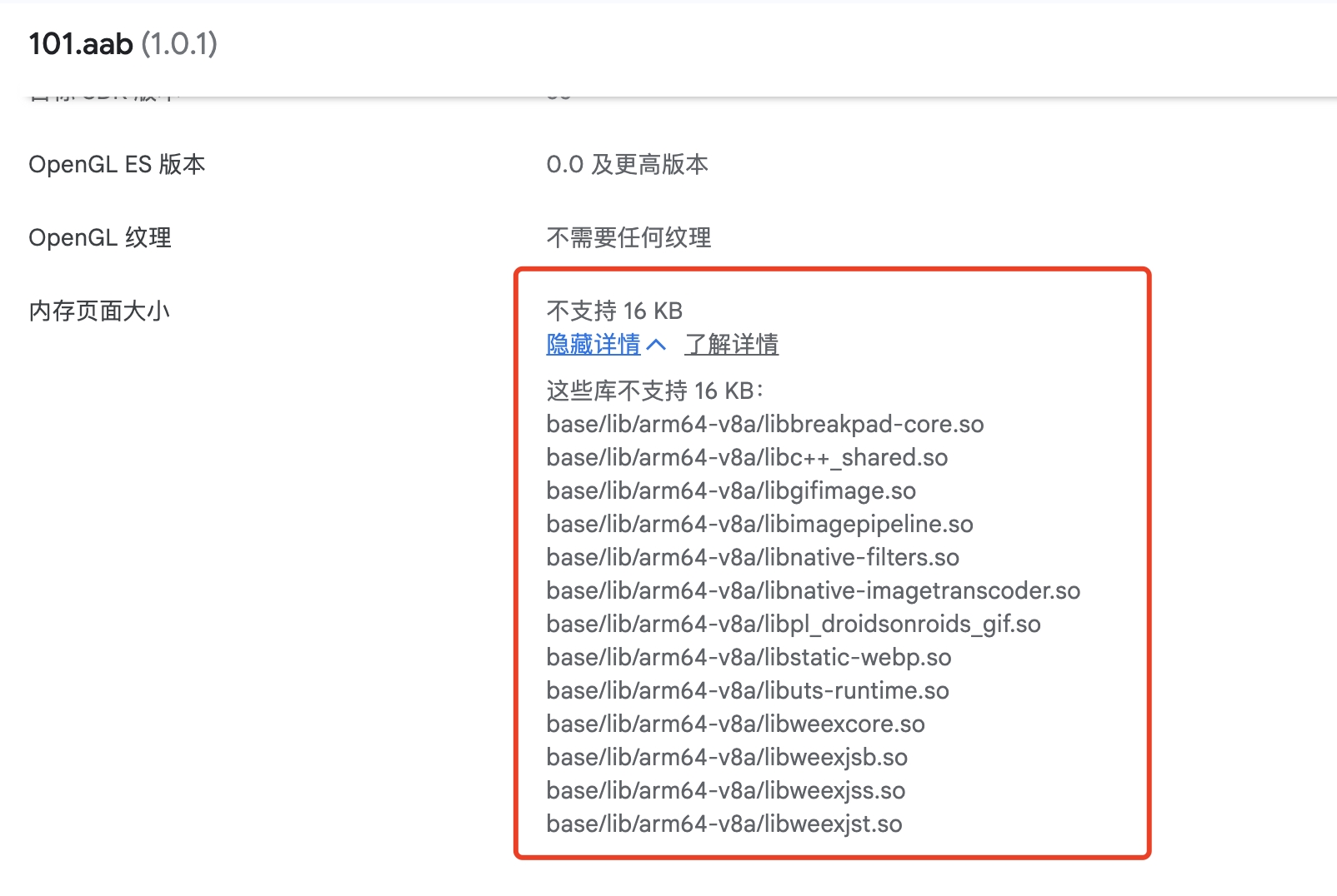 ←政策状态 问题详情 应用必须支持 16 KB 的内存页面大小 状态 A 您将无法发布应用更新 (还剩 17天) 发送日期 2025年8月28日 最后期限 2025年11月1日 为确保您的应用能在最新版 Android 上正常运行,Google Play 要求以 Android 15 及更高版本为目标平台的应用支持 16 KB 内存页面大小。 自 2025年11月1日起,如果您的应用更新不支持16 KB内存页面大小,您将无法发布相应更新。 您的最新正式版应用不支持16 KB 内存页面大小。 查看 app bundle 解决方法 请创建支持16 KB 内存页面大小的新版本,并将其发布到正式版轨道。 如需构建支持 16 KB 的 app bundle, 请按照有关支持 16 KB 设备的说明操作。 您可以查看最新版本和 app bundle,了解新上传的 app bundle 是否支持 16 KB。 如需了解详情,请参阅以下内容: 为通过 Google Play 分发的应用做好准备,使其适配采用 16 KB 页面大小的设备 在 16 KB 环境中测试应用 使用 Android Studio让 Android 应用和游戏改为使用 16 KB 页面大小 阅读技术要求公告 这些内容是否有用?