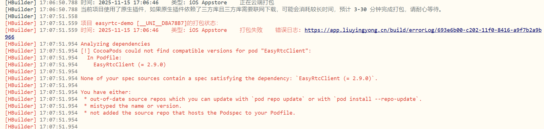 在UTS插件中配置自定义pod源时,云端打包环境与本地模拟器环境存在差异。从报错信息看,云端构建时未能正确识别您指定的私有源,导致无法找到EasyRtcClient 2.9.0版本。