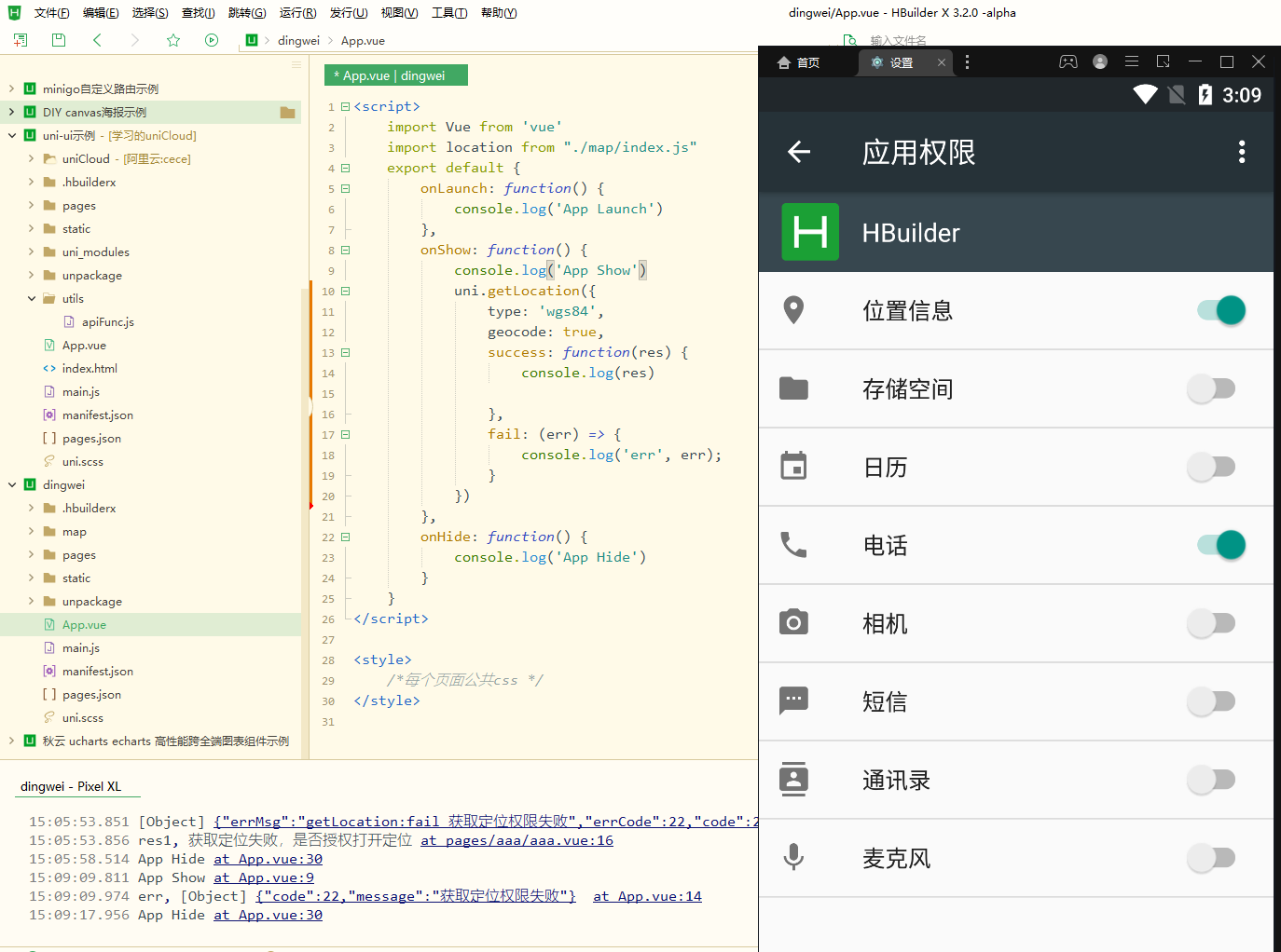 手机没办法同时截图,使用的模拟器截图,上面是在设置中给了应用位置权限,但是返回app还是获取位置失败,只有关掉app重新启动才可以获取到用户位置信息!