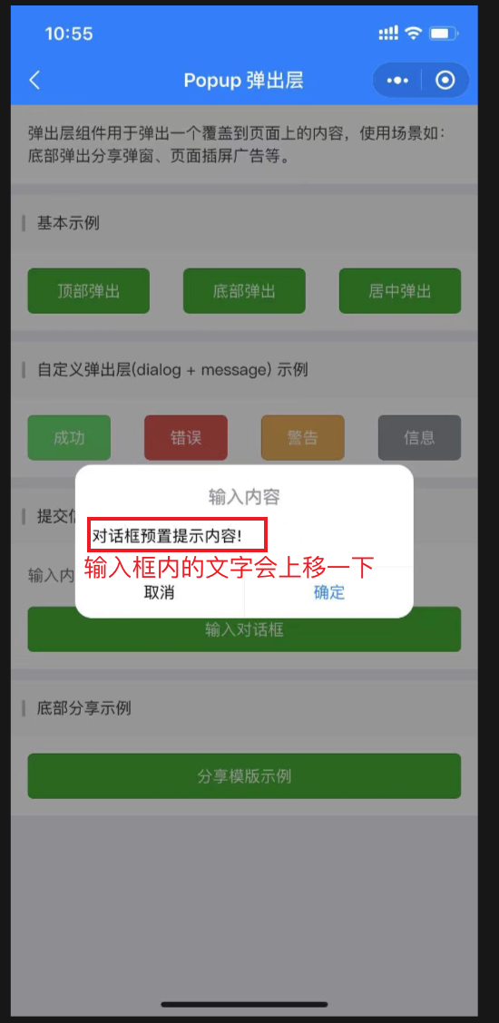 【报Bug】uni-app开发的微信小程序,官方的demo小程序HelloUniapp,拓展组件页面的进入的PopUp弹出层页面;当点击输入对话框时候,弹出框内的input输入框内的问题会瞬间上移一下,无论是input还是textarea每次打开输入对话框时候都会出现这个bug;就会导致如果textarea内容过多,打开弹框的瞬间文字是超出文本框的,然后才会自动换行正常。官方的demo就可以直接看到此bug,还望修复下。