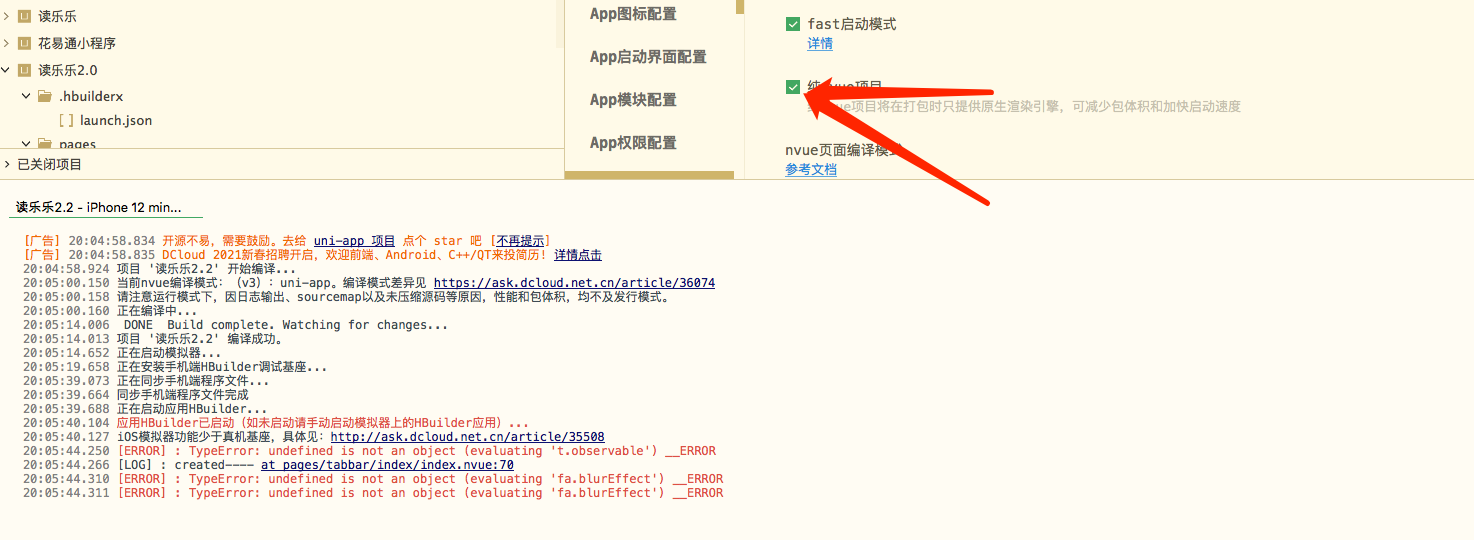 - 在manifest.json中 取消纯nvue项目后运行正常,勾选后报错