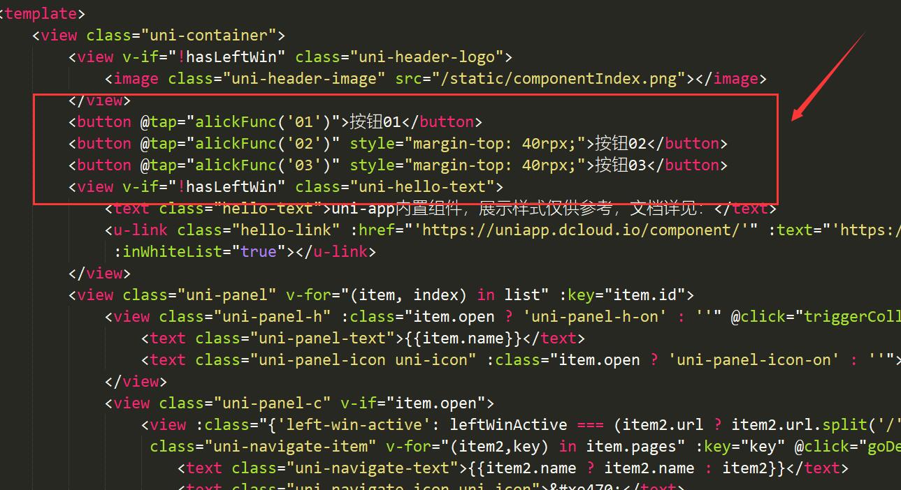uniapp01.jpg是页面,页面上有三个按钮按钮01,按钮02,按钮03,