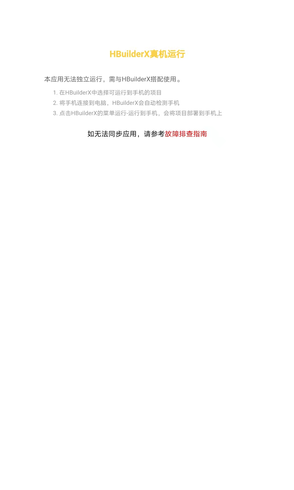 真机调试运行启动后提示“本应用无法独立运行,需与HBuilderX搭配使用”页面