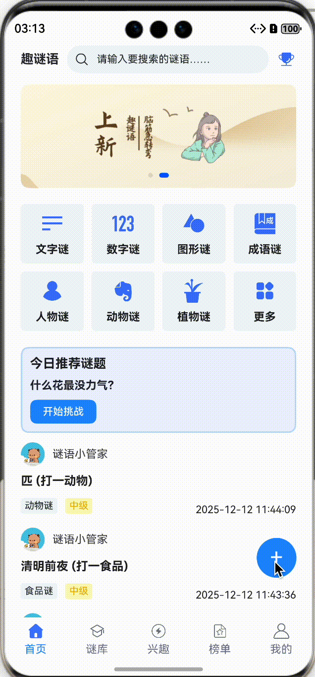 在最近上架的应用趣谜语中,有一个功能,点击悬浮菜单后,弹出子菜单,效果如下: