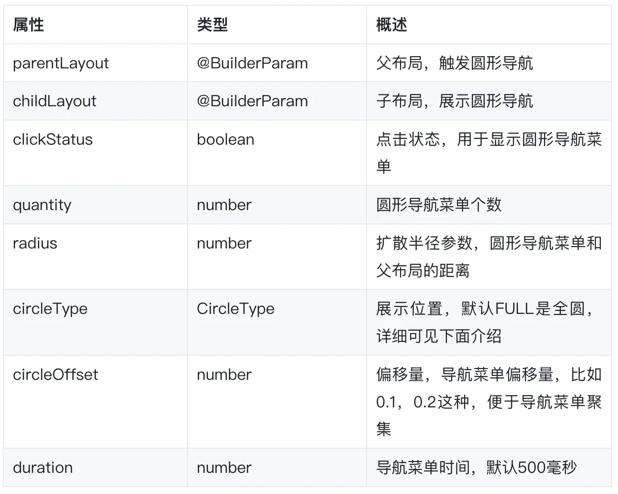 需要实现三个属性,parentLayout属性是,父布局,也就是触发的视图,childLayout是子布局,是圆形导航菜单,clickStatus是展示状态,当然了,也有默认的一套UI,如果符合,也可以直接使用默认的。