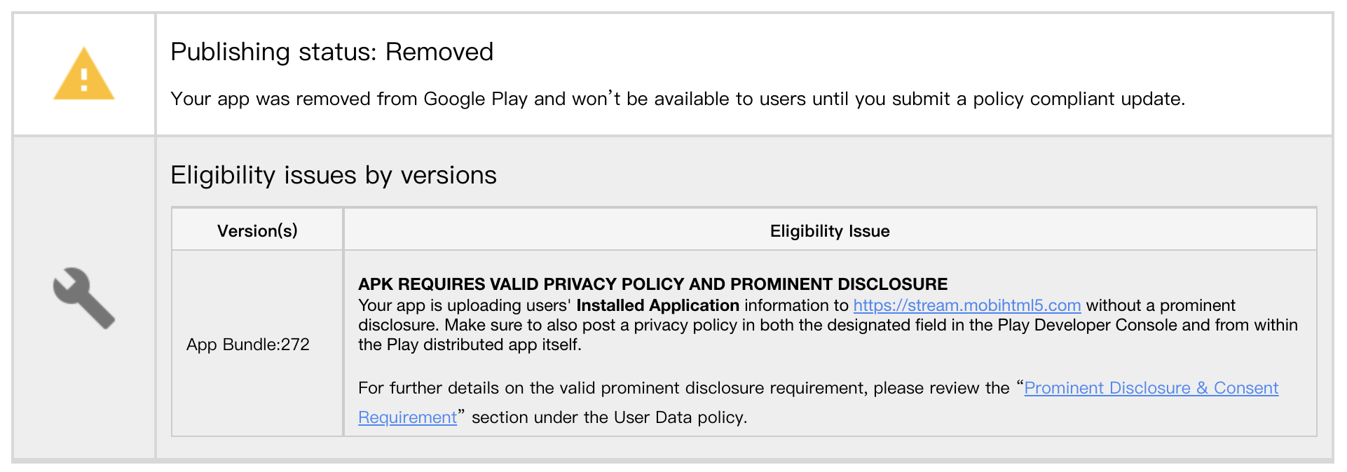 - 使用aab的包的方式在谷歌商城发布被下架,说app里会通过 https://stream.mobihtml5.com 收集用户安装信息。这个需要怎么解决,我在源码里没有发现这个地址。望解决