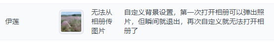 我的用户反馈:自定义背景设置,第一次打开相册可以弹出照片,但瞬间就退出,再次自定义就无法打开相册了,我没这款机子我复现不了,我那里只调用了uni.chooseImage