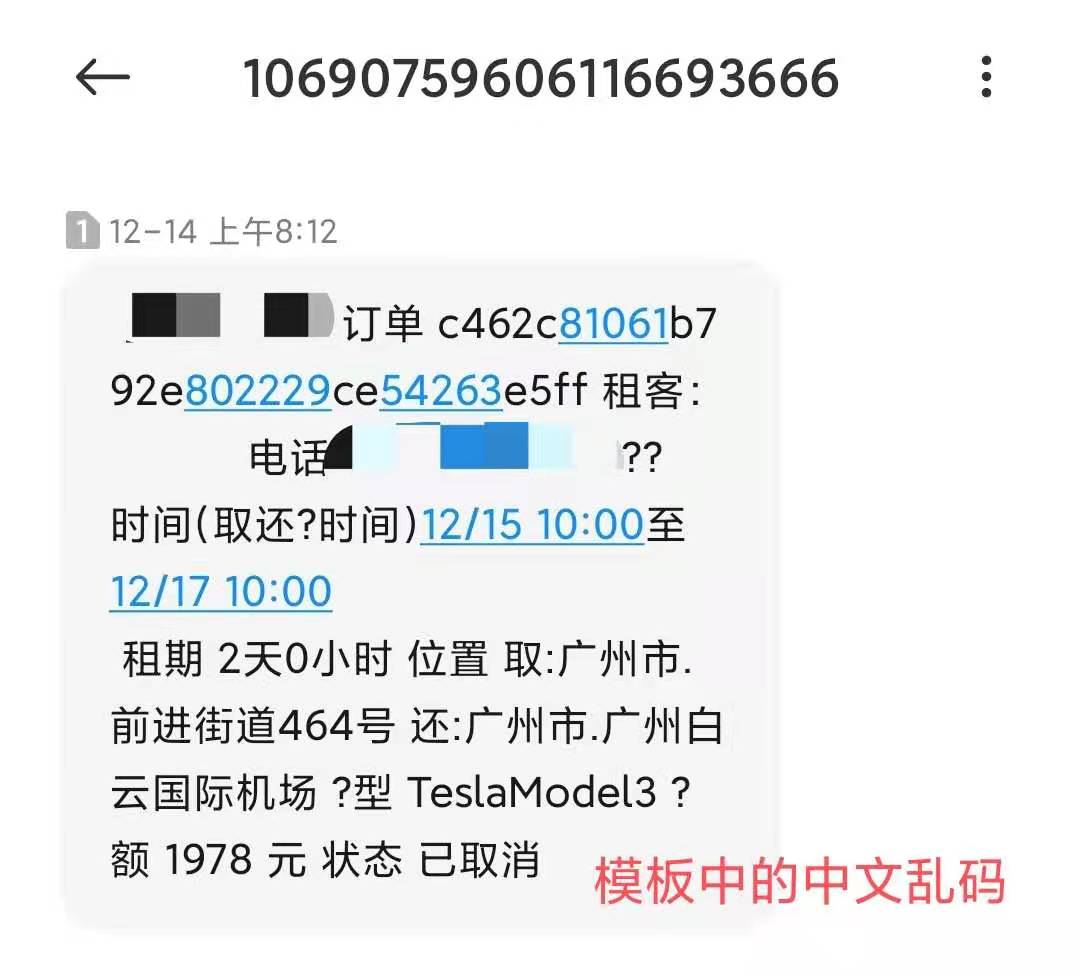 使用sendSms短信服务收到的短信中部分中文变成“?”,且这个中文不是短信中的变量而是模板中的文字。