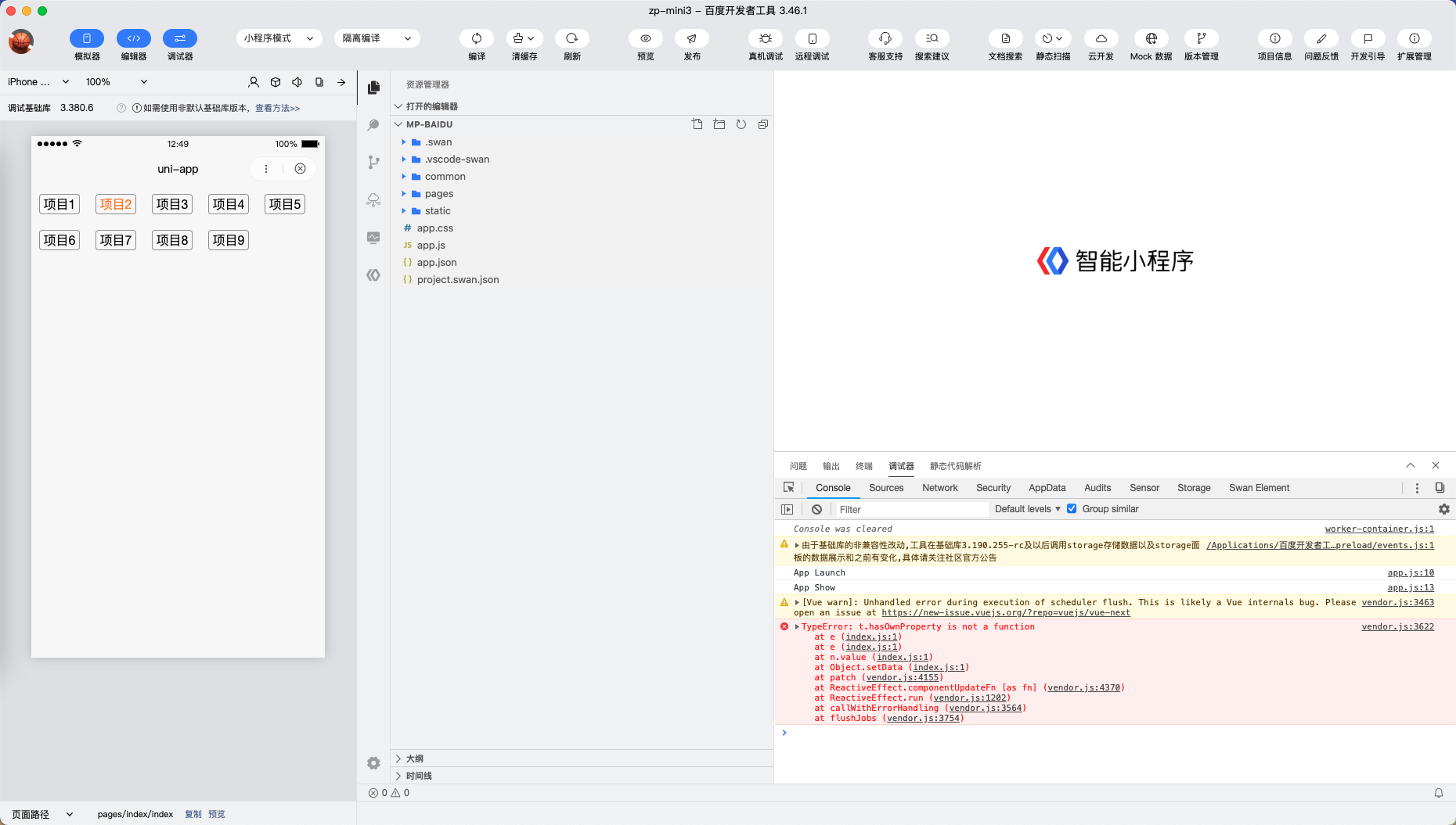 - Vue3模式下,运行至百度小程序,切换选中项,控制台报错TypeError: t.hasOwnProperty is not a function