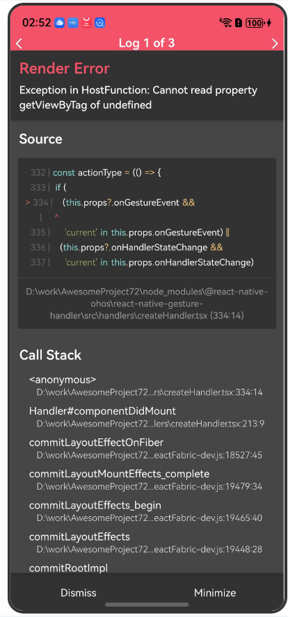根据你提供的报错信息和代码,问题主要出在依赖版本冲突和配置上。错误信息显示 react-native-gesture-handler 库的 GestureHandlerRootView 组件在渲染时出现了问题,这通常是由于版本不匹配或配置不当引起的。