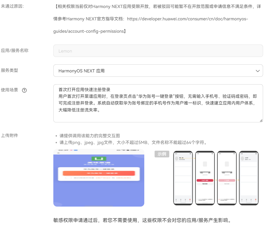 我想实现一个获取华为账号一键登录的问题 申请权限后提示权限不满足条件 申请资料如下