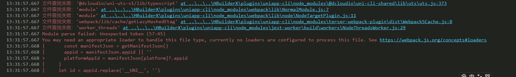 bug描述: 4.85运行/打包 报错。 13:31:57.667 文件查找失败:’@dcloudio/uni-uts-v1/lib/typescript’ at …\HBuilderX\plugins\uniapp-cli\node_modules[@dcloudio](/user/dcloudio)\uni-cli-shared\lib\uts\uts.js:373 13:31:57.667 文件查找失败:‘module’ at …\HBuilderX\plugins\uniapp-cli\node_modules\webpack\lib\NormalModule.js:7 13:31:57.667 文件查找失败:‘module’ at …\HBuilderX\plugins\uniapp-cli\node_modules\webpack\lib\node\NodeTargetPlugin.js:11 13:31:57.667 文件查找失败:‘webpack/lib/cache/getLazyHashedEtag’ at …\HBuilderX\plugins\uniapp-cli\node_modules\terser-webpack-plugin\dist\Webpack5Cache.js:8 13:31:57.667 文件查找失败:‘worker_threads’ at …\HBuilderX\plugins\uniapp-cli\node_modules\jest-worker\build\workers\NodeThreadsWorker.js:29 13:31:57.667 Module parse failed: Unexpected token (57:45) 13:31:57.667 You may need an appropriate loader to handle this file type, currently no loaders are configured to process this file. See https://webpack.js.org/concepts#loaders 13:31:57.668 | const manifestJson = getManifestJson() 13:31:57.668 | appid = manifestJson.appid || ‘’ 13:31:57.668 > platformAppId = manifestJson[platform]?.appid 13:31:57.668 | } 13:31:57.668 | let id = appid.replace(‘UNI’, ‘’) 下载历史版本4.76正常