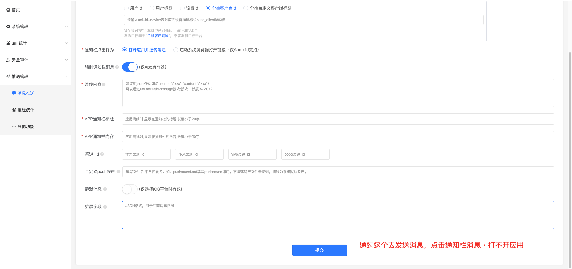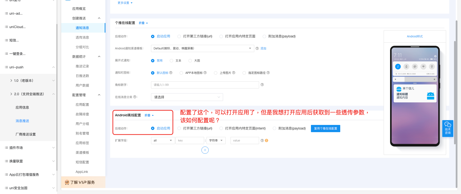 回复 套马杆的套子: 我通过Dclound后台发送通知消息,配置Android离线配置:后续动作为启动应用之后就可以打开了。 我之前都是通过uni-admin后台推送的,就打不开应用。你可以下面评论我放的图。 但是我有个疑问,对于华为和小米,我想打开应用后拿到透传的消息,该怎么实现呢?