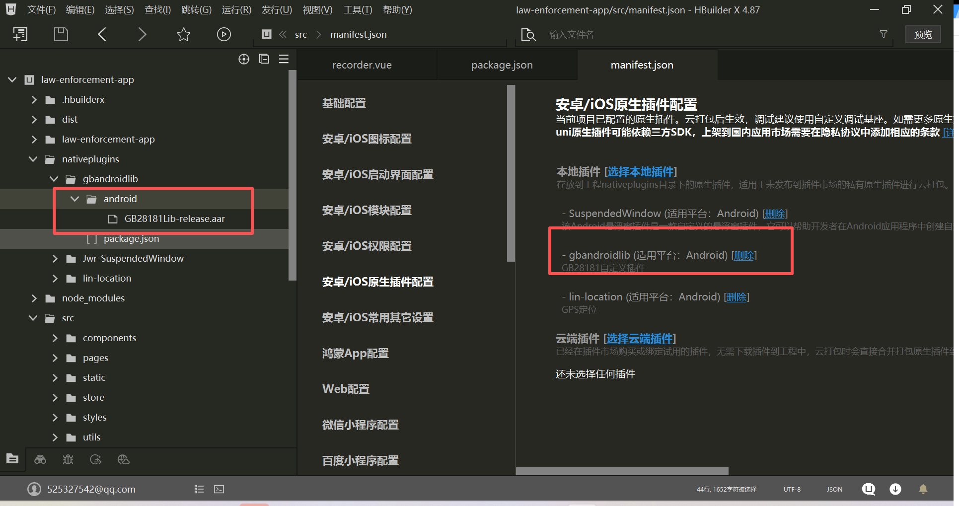 manifest.json中nativePlugins配置与插件package.json的id严格一致(此处"gbandroidlib"匹配)