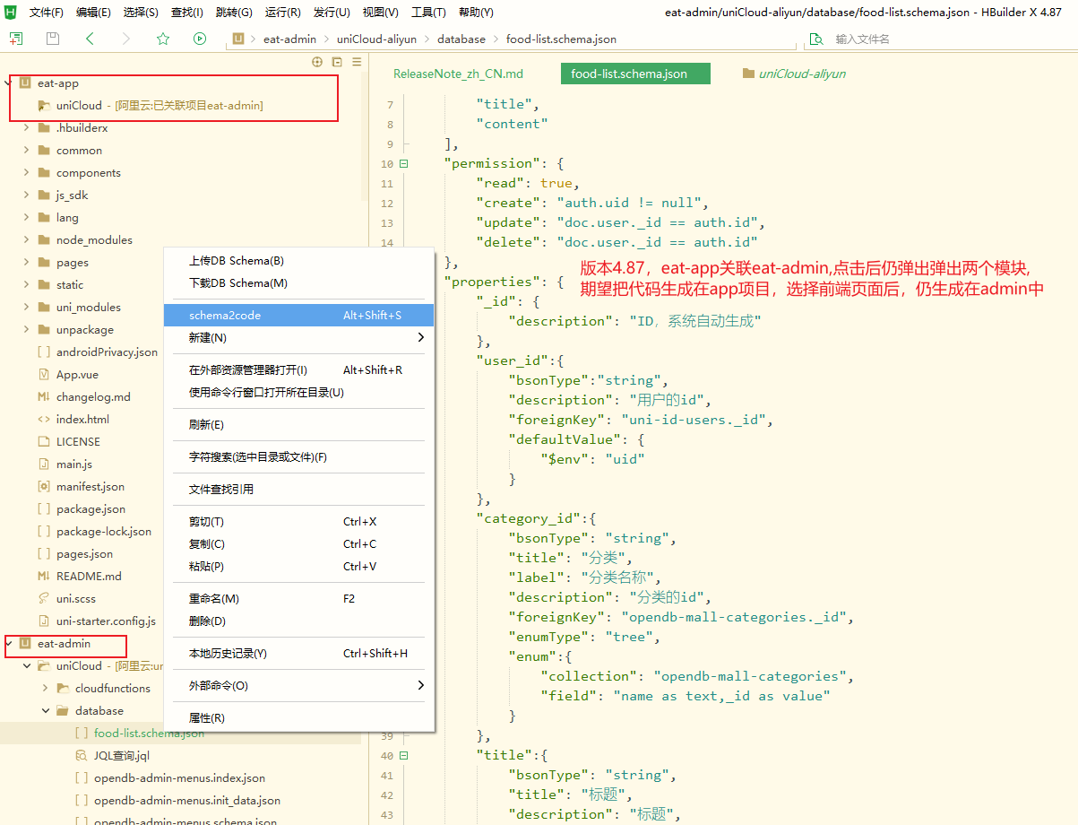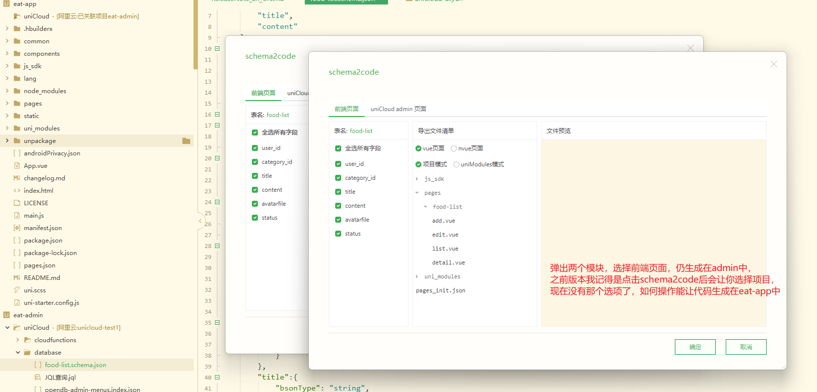 - uni-admin 将uni-starter云空间(我用的阿里云)关联在admin,在admin项目中创建list.schema.json,右键点击list.schema.json,选择schema2code,弹出两个模块,选择前端页面后无法在uni-starter项目生成对应代码,生成在admin项目了