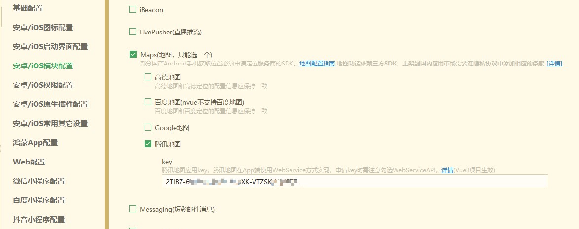 manifest.json→App模块配置→ 勾选Maps(地图)→ 选择腾讯地图。 - 在