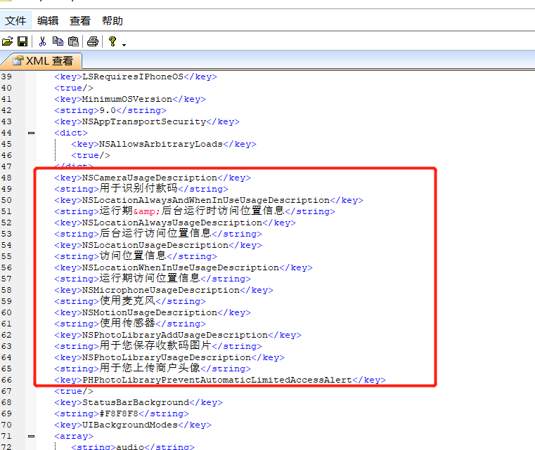 2. 对已完成打包的文件,解压查看info.Plist 发现多个未被选择和未配置的权限项被添加导致appstore无法通过审核上架